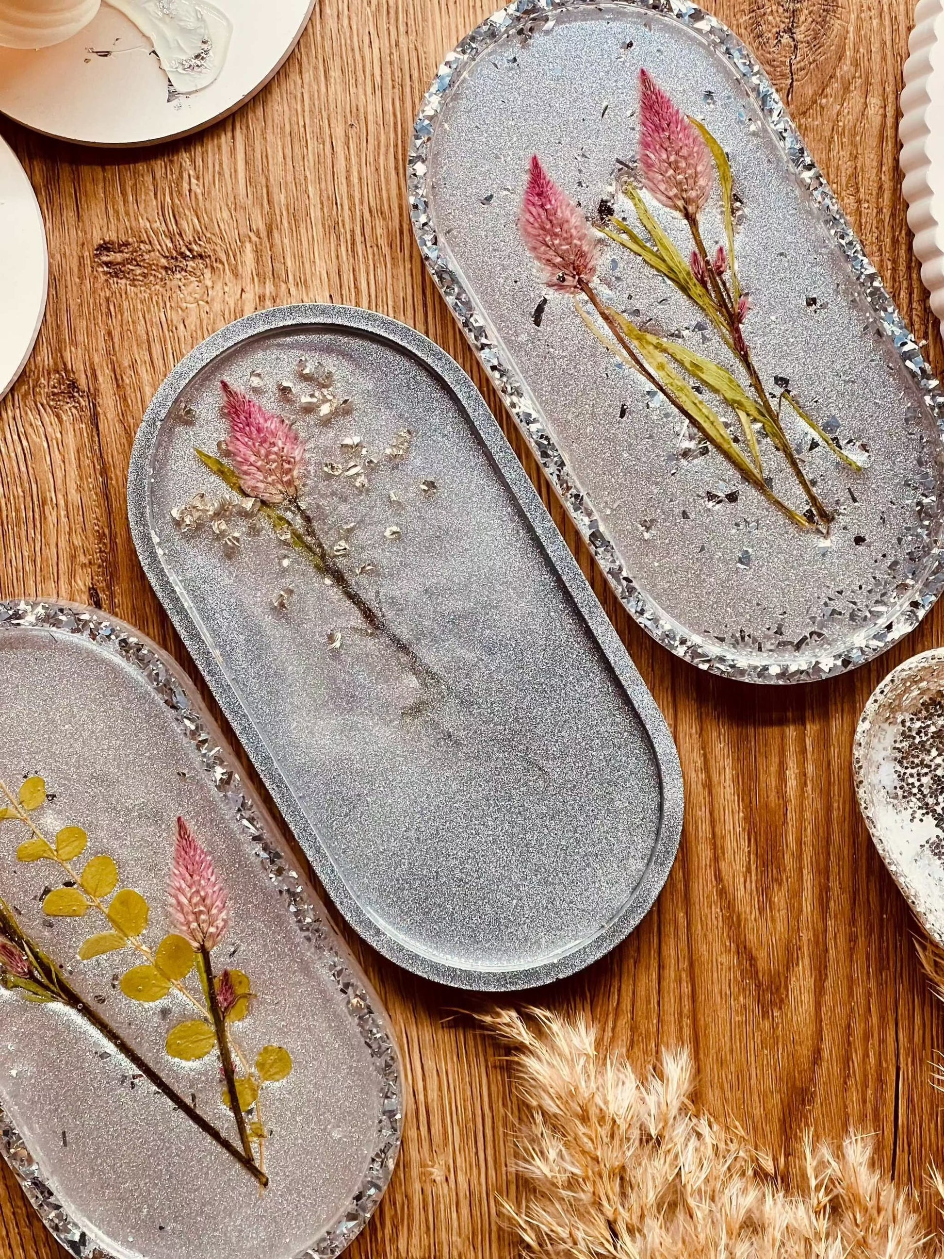 Schmuckschalen aus Resin in Weiß mit Silber und Blumen