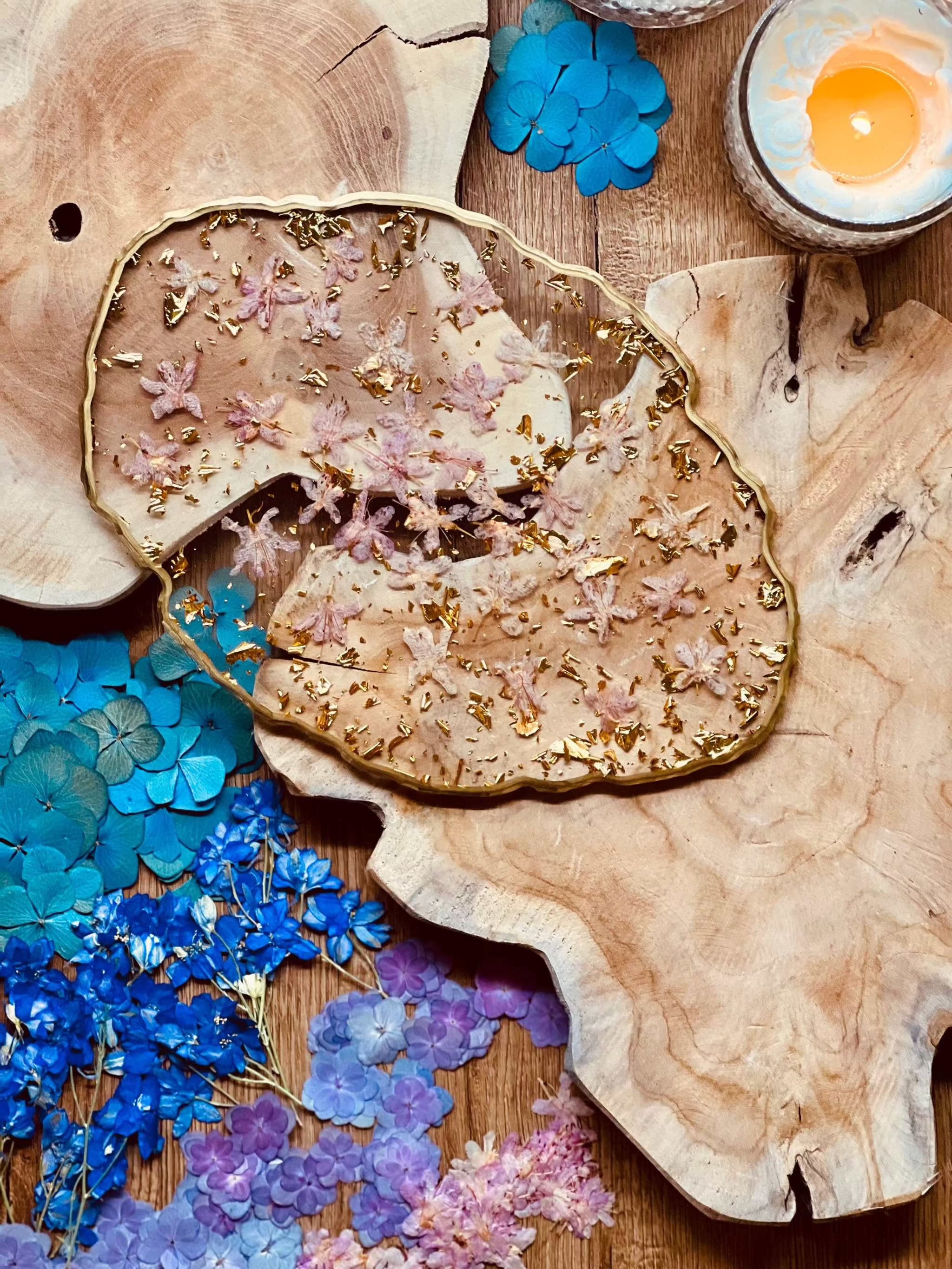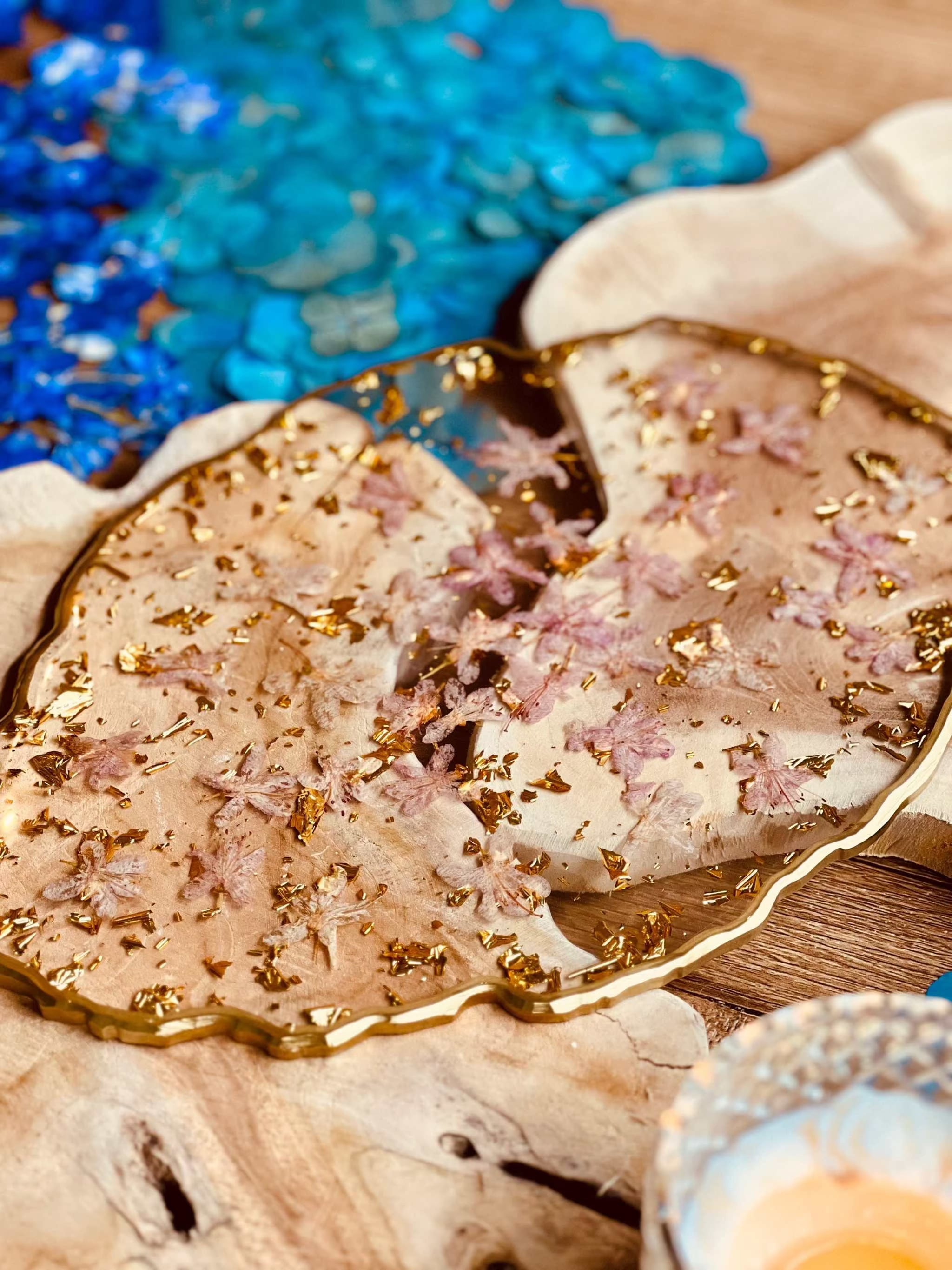 Tablett aus Resin mit rosa Rhododendron Blüten und goldenen Details