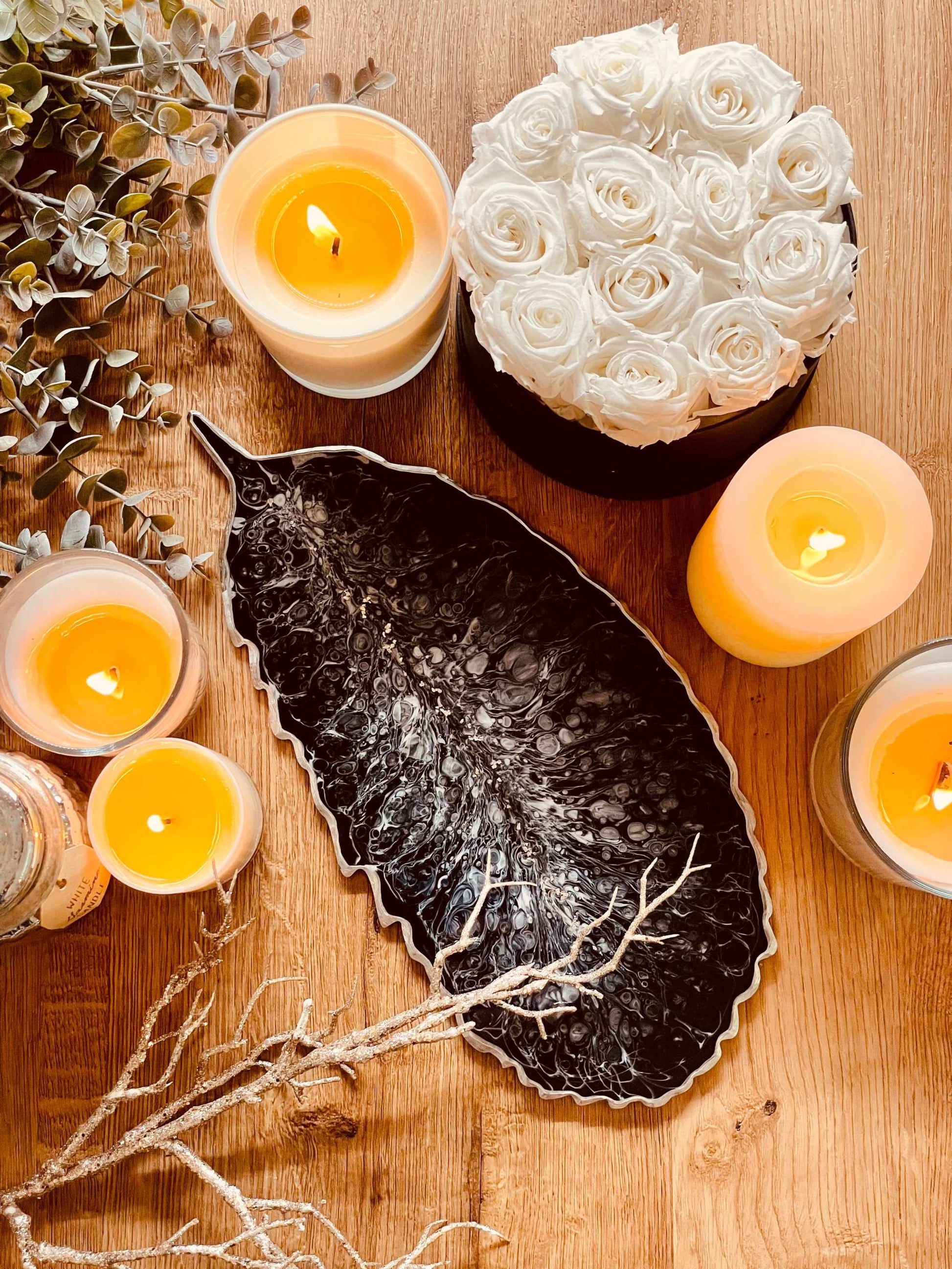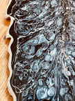 Handgemachtes Tablett aus Resin in Schwarz mit silbernen Details. Alle meine Artikel sind einzigartige Unikate. Tabletts sind die perfekte Dekoration auf jedem Tisch oder Möbelstück und ein individuelles Geschenk für deine Liebsten. Maße: Ca. 35x17cm