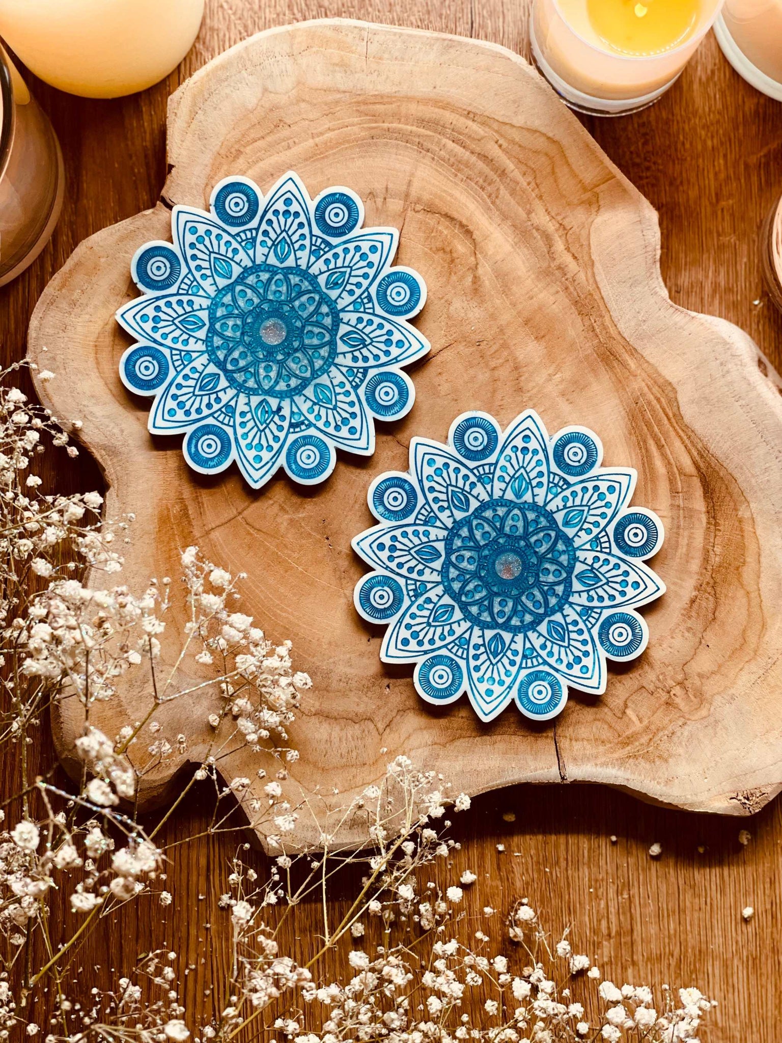 2 Mandala Untersetzer aus Resin in Weiss mit Blau