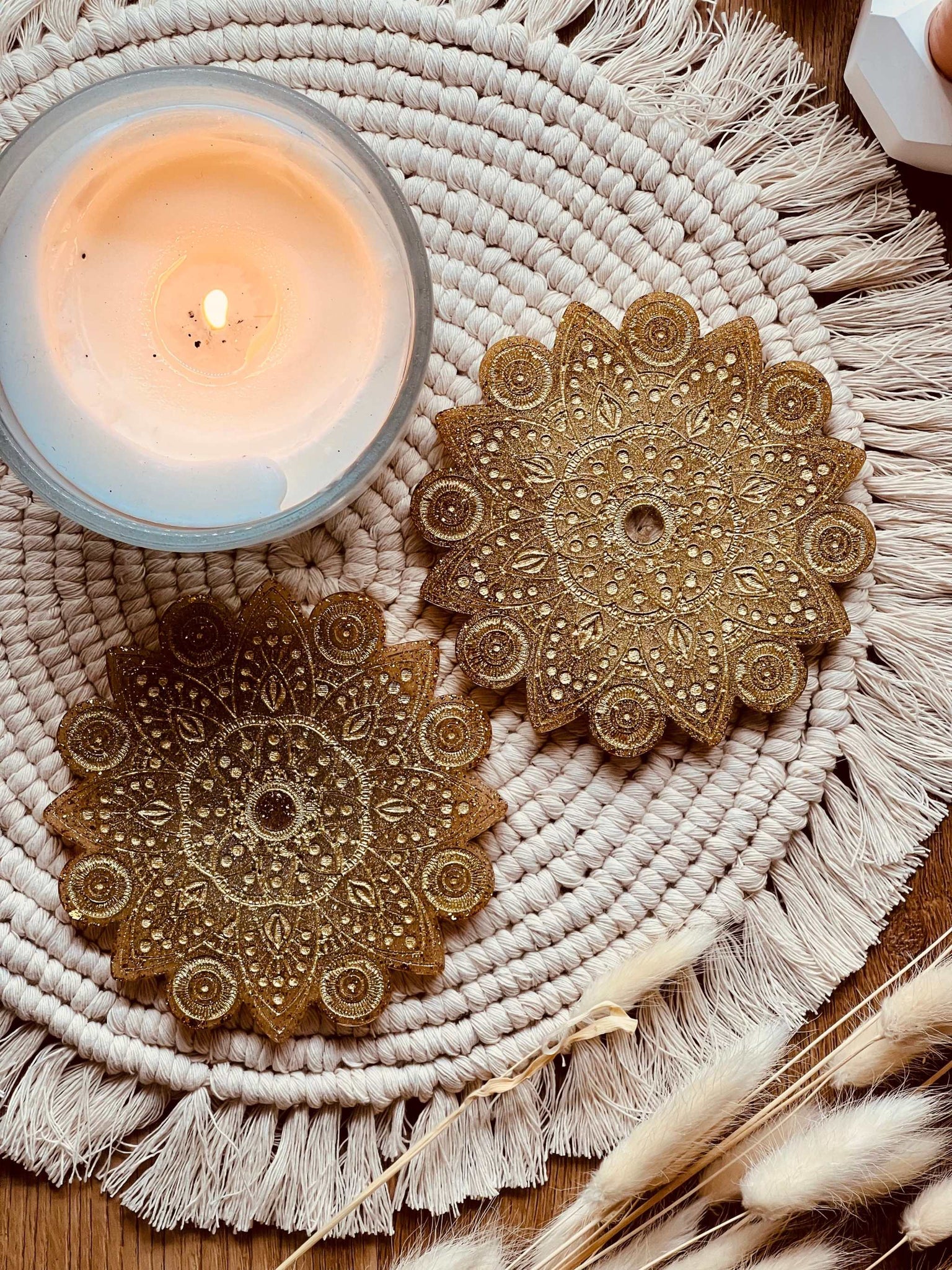 Handgemachte Untersetzer aus Resin in gold im Mandala Design im 2-teiligen Set. Alle meine Artikel sind einzigartige Unikate. Diese Untersetzer sind die perfekte Dekoration auf jedem Tisch und ein individuelles Geschenk für deine Liebsten. Maße: Durchmesser ca. 12cm.