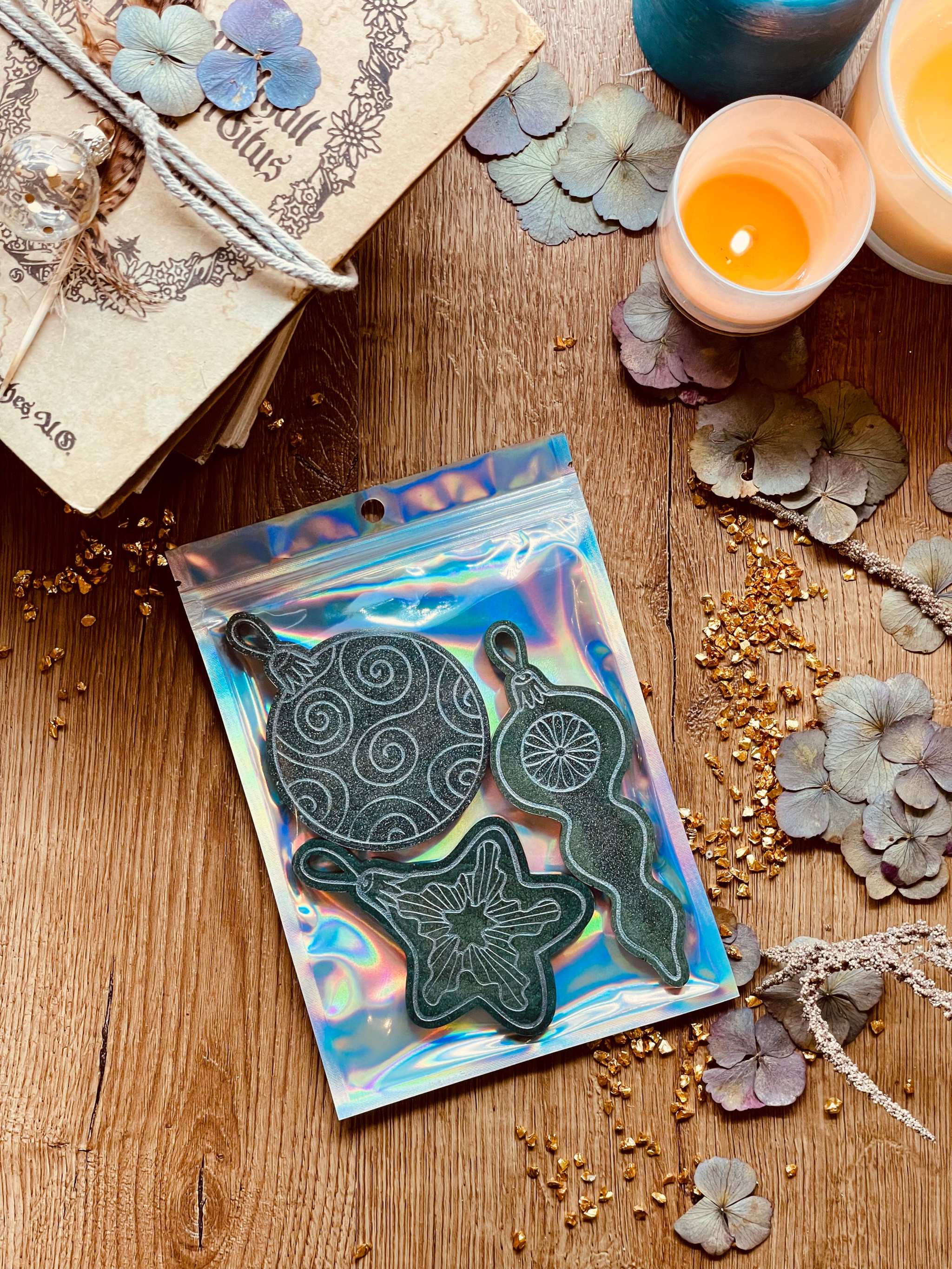 Handgemachte Anhänger aus Resin in Grün und Silber im 3-teiligen Set. Alle meine Artikel sind einzigartige Unikate. Diese Anhänger sind der Blickfang an jedem Weihnachtsbaum, eine tolle Dekoration in der Winterzeit und ein individuelles Geschenk für deine Liebsten. Maße ca. 8-14cm